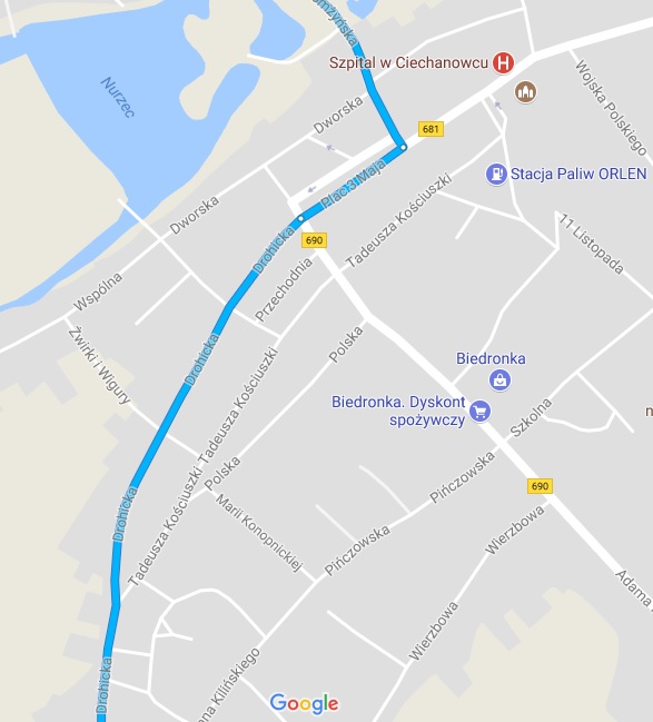 - Ciechanowiec (kierować się poczatkowo na Siemiatycze, na rynku odbić na ulicę Drohicką)